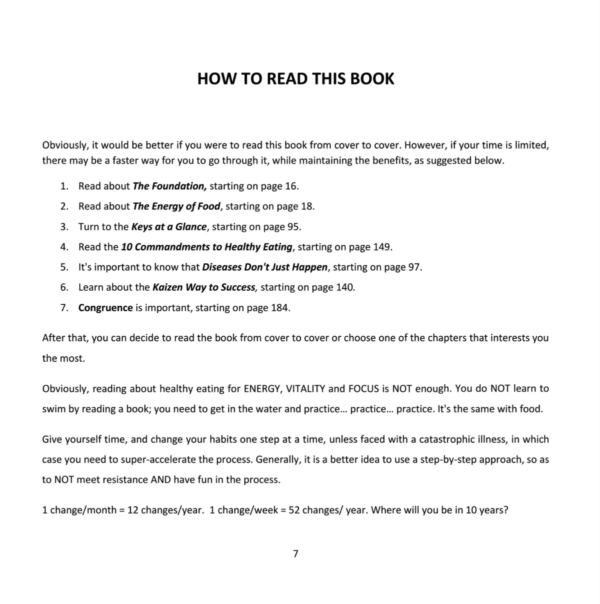 Easy to read, with lots of pictures and summaries, guiding you through the energy of foods, including beverages, meat, fruits, vegetables, mushrooms, algae, supplements and more (17 sections), with a chapter on cleansing/detoxing, a chapter on the progression of dis-eases, with a special note on "poly-ticks."