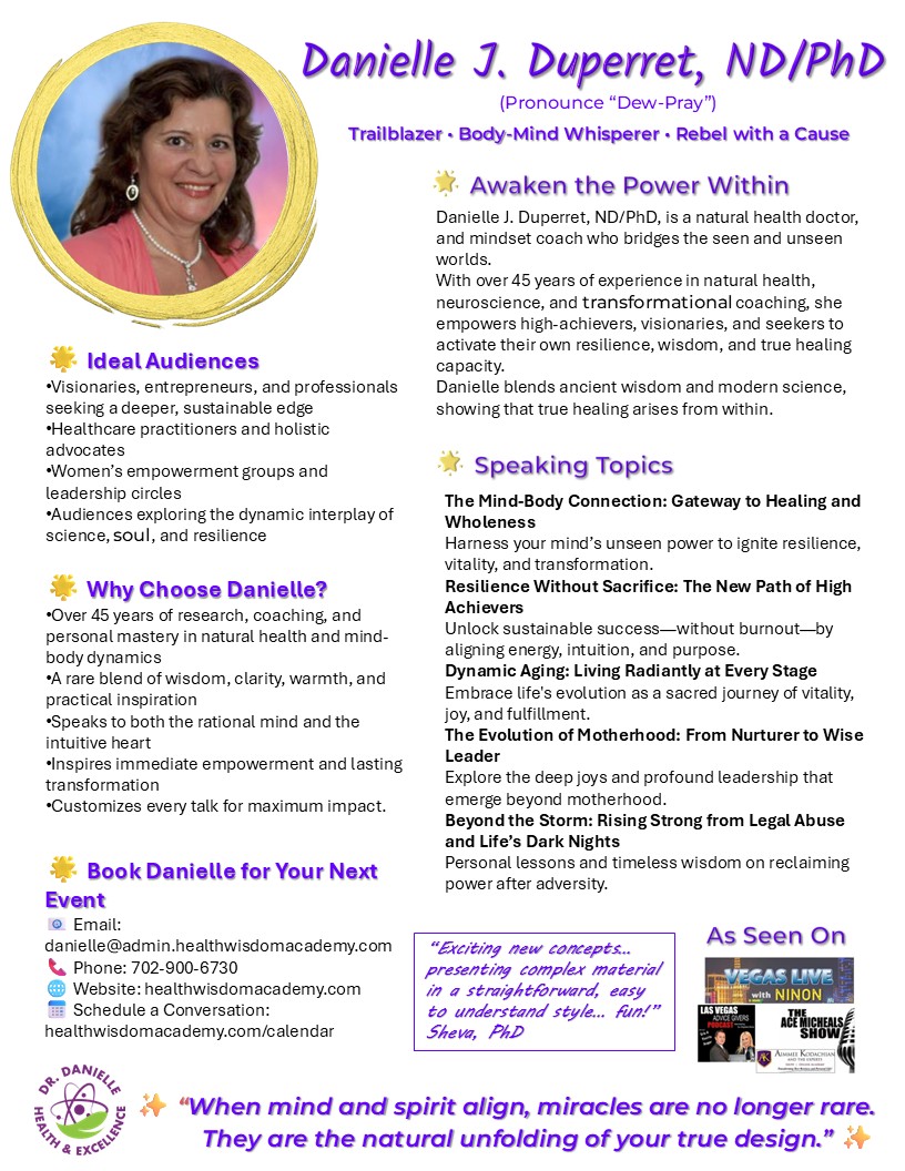 Danielle J. Duperret, ND/PhD, (pronounce dew-pray) brings over four decades of expertise in holistic health, mental fitness, and dynamic living.