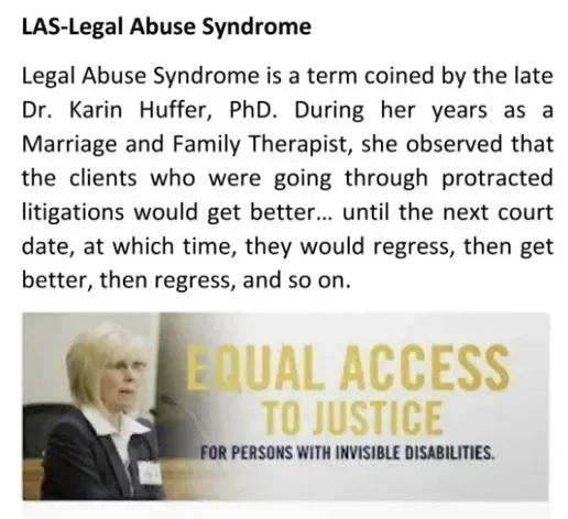 In 2006, I was diagnosed with Complex/Chronic PTSD (Post Traumatic Stress Disorder) and LAS-Legal Abuse Syndrome, as well as with Anhedonia.